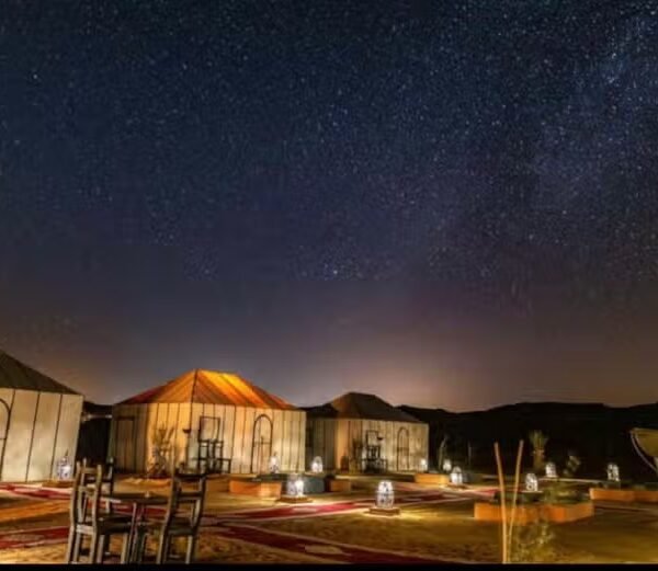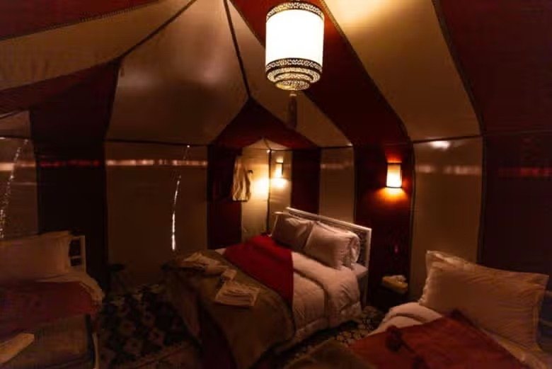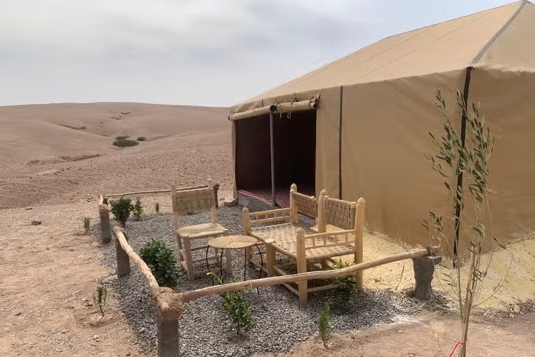 Este tour incluye una noche de alojamiento en un campamento del desierto de Agafay. Todas las haimas están equipadas con baño privado y tienen capacidad para un máximo de 6 personas.